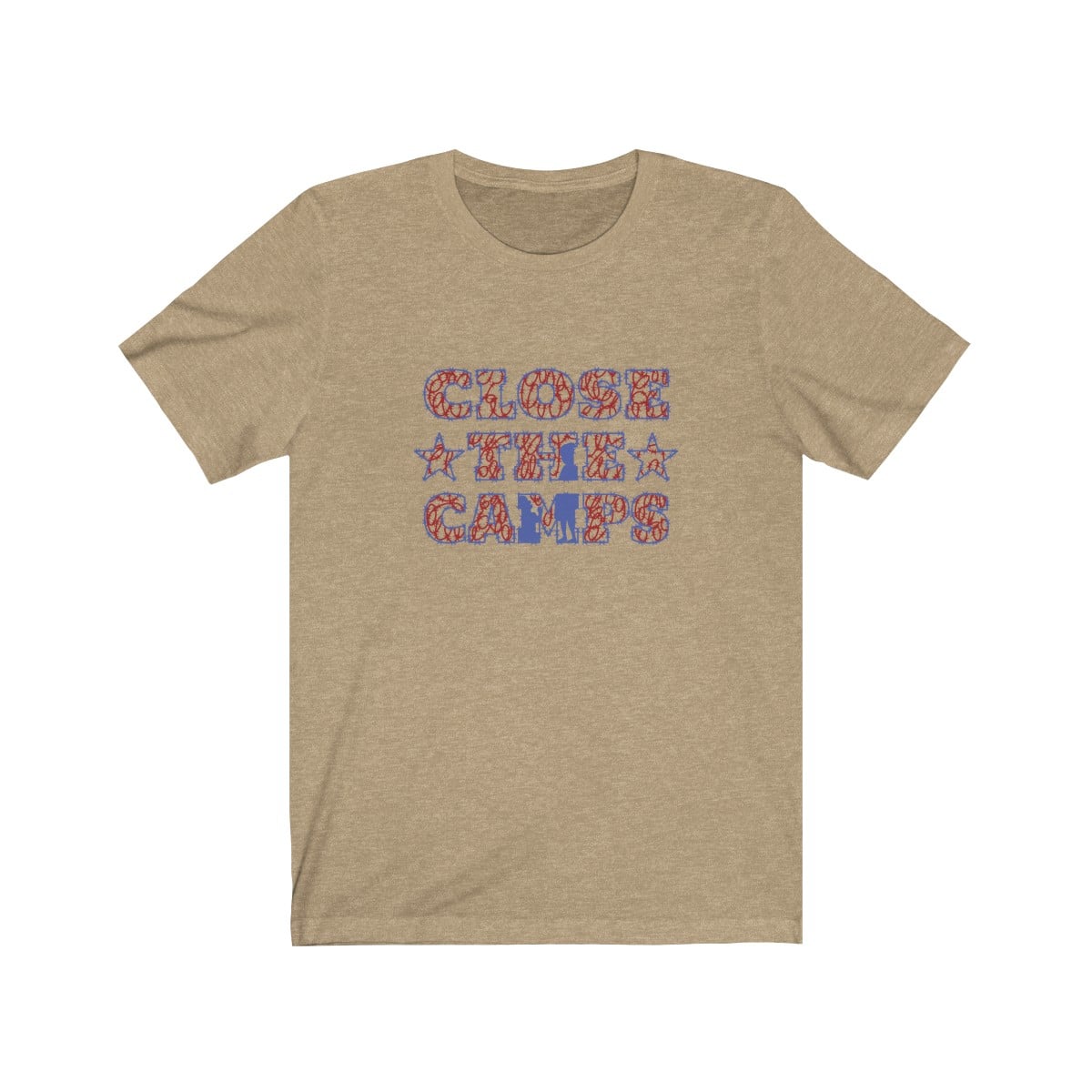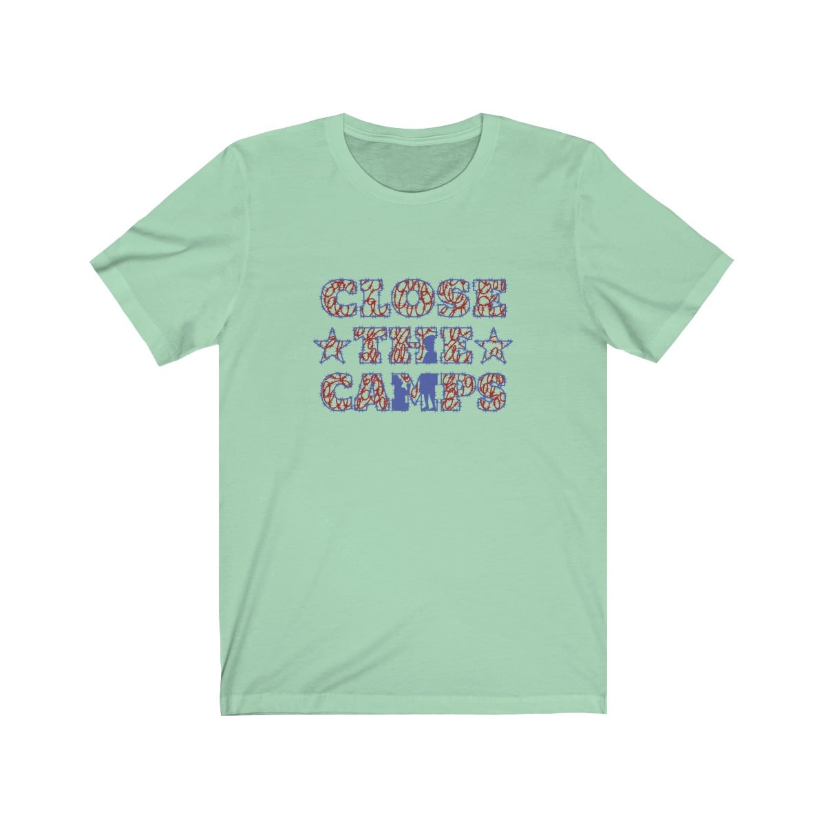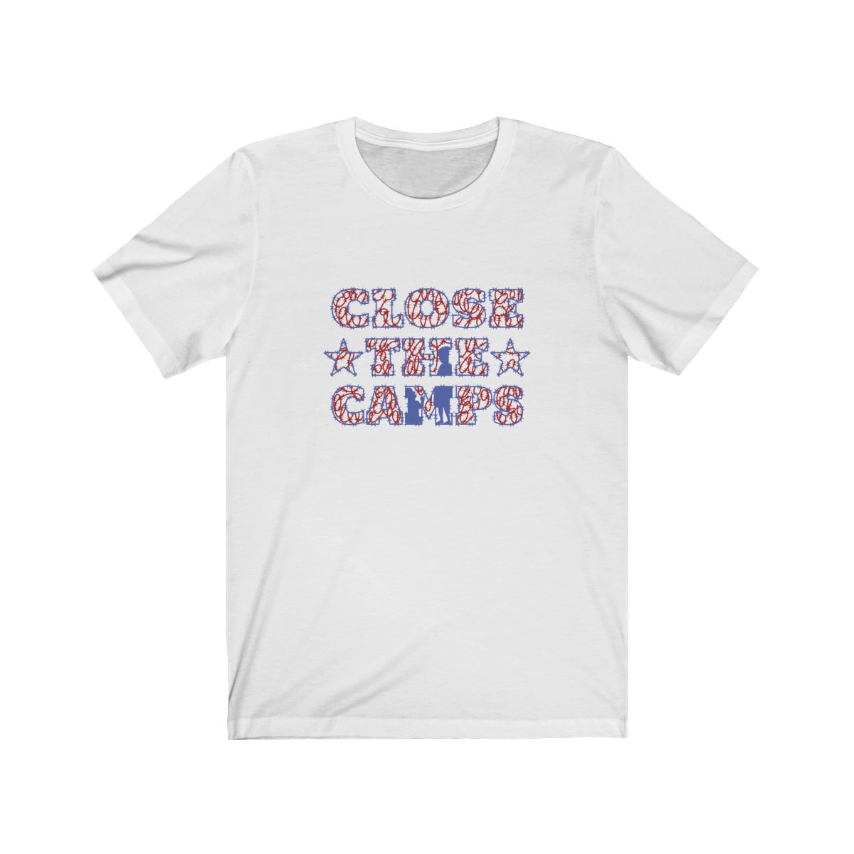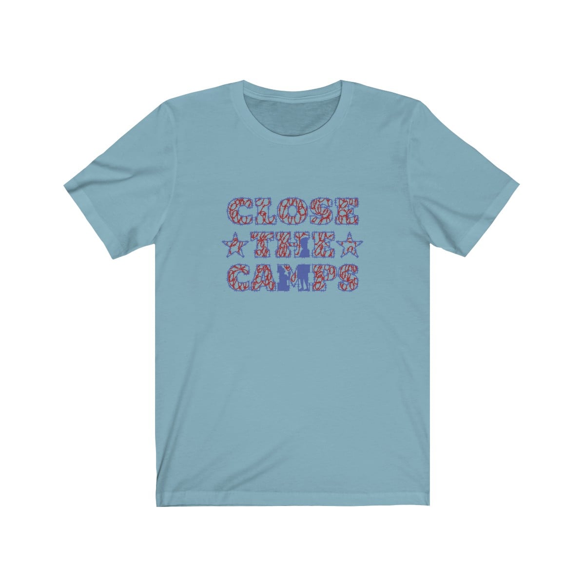 This premium unisex soft cotton tee features the words “CLOSE THE CAMPS” constructed from razor wire and containing stencilled imprisoned children.