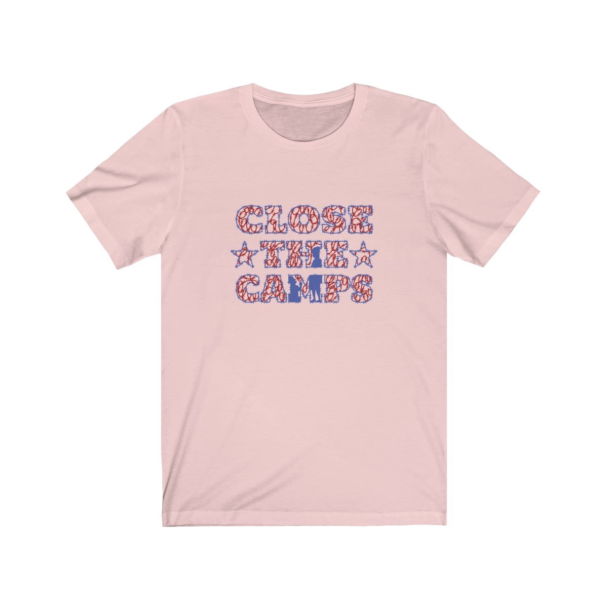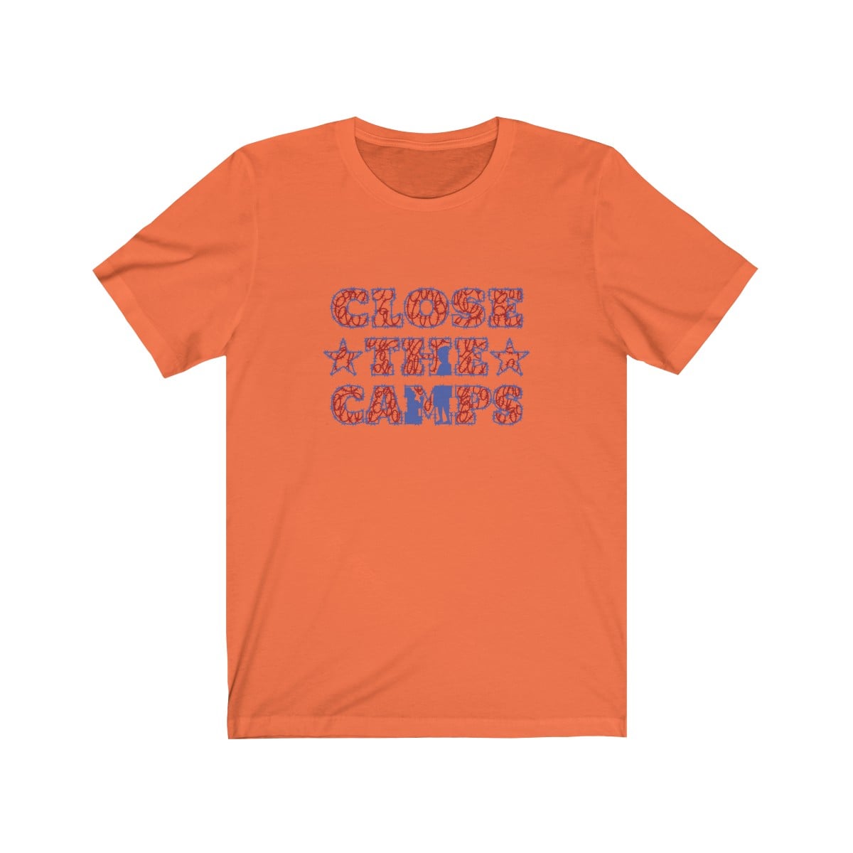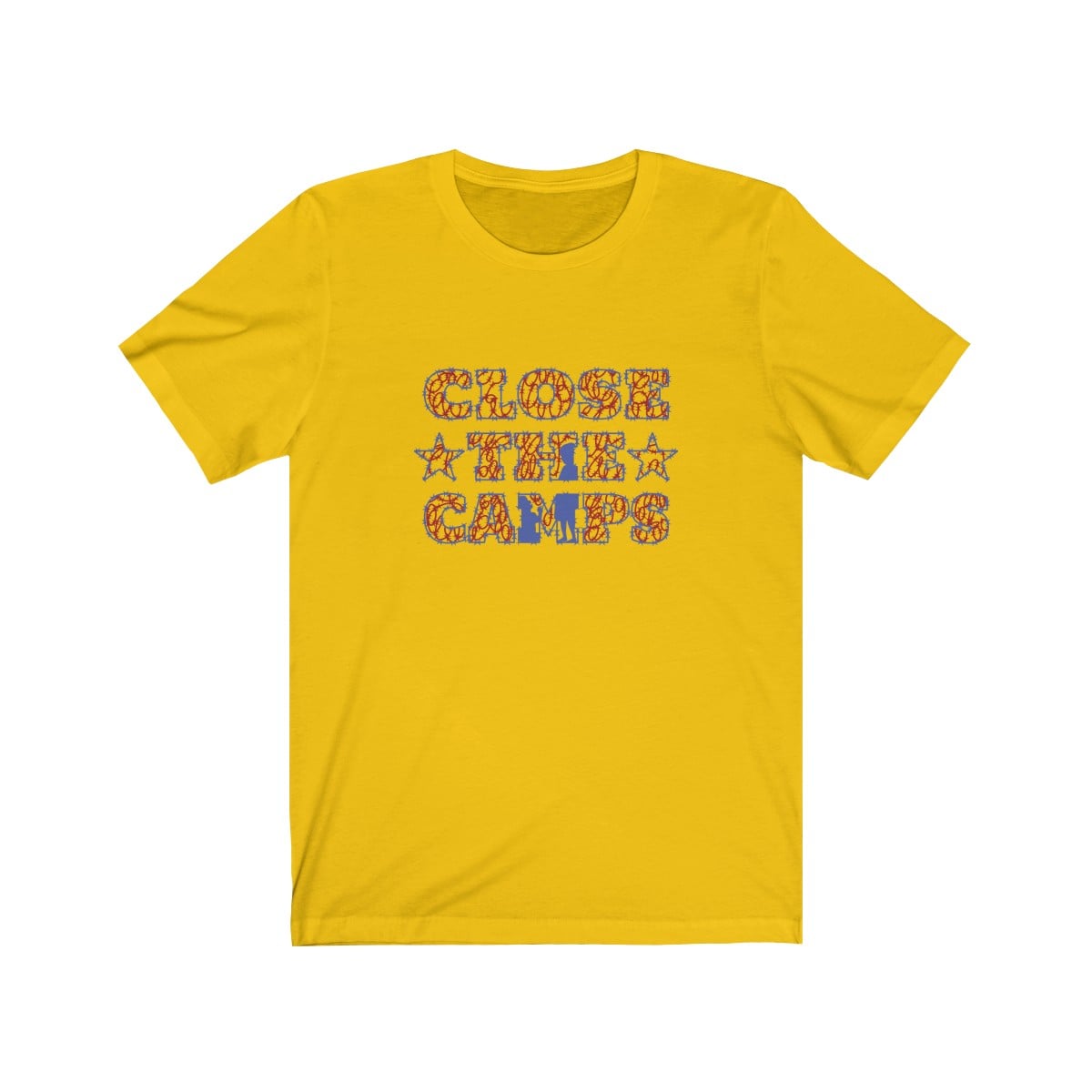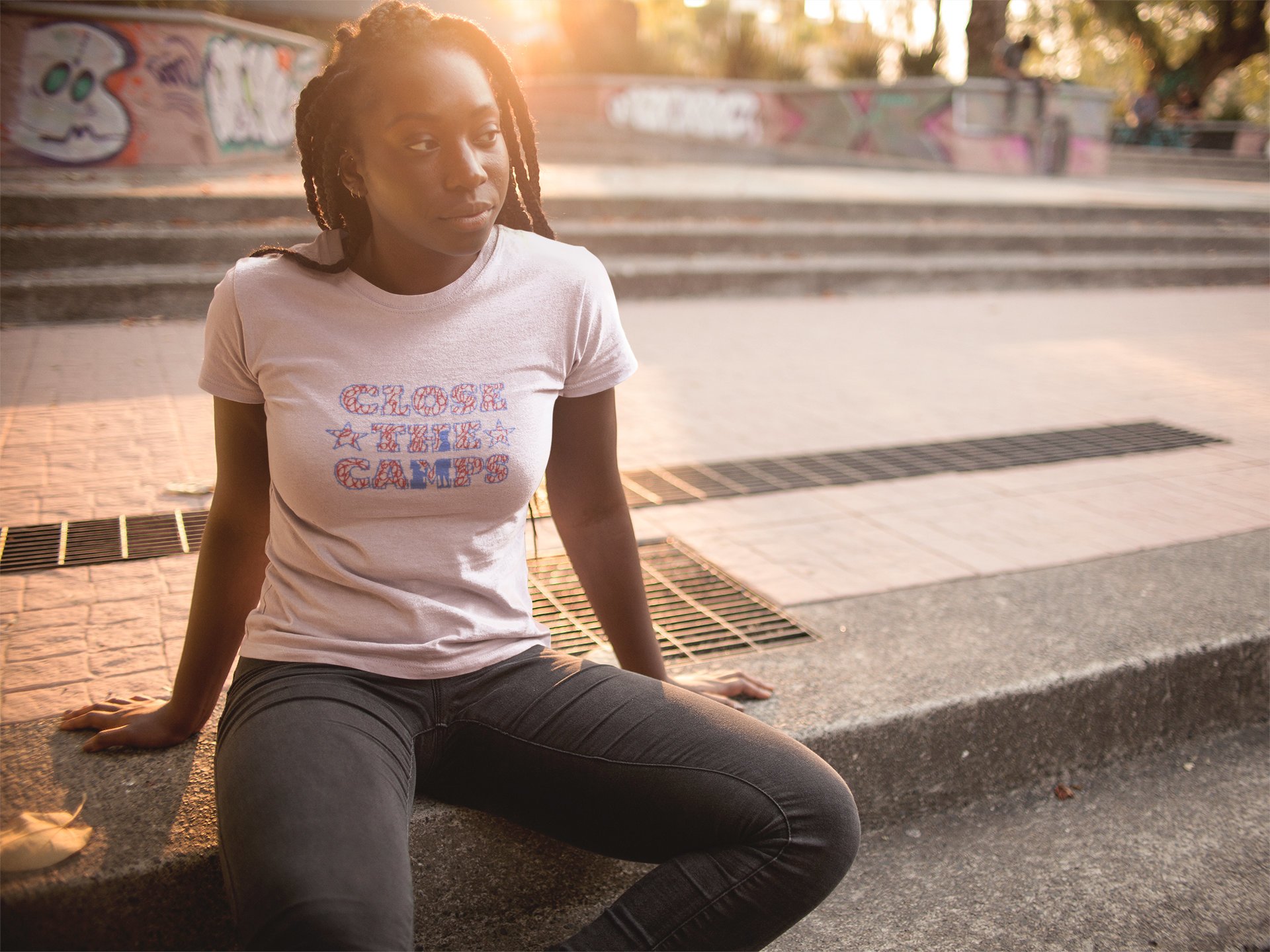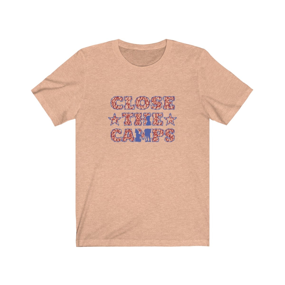 This premium unisex soft cotton tee features the words “CLOSE THE CAMPS” constructed from razor wire and containing stencilled imprisoned children.
