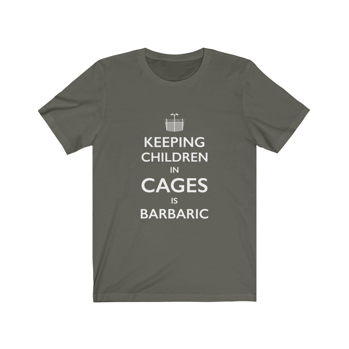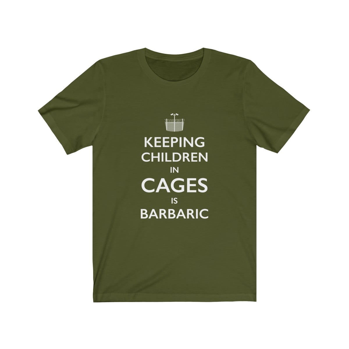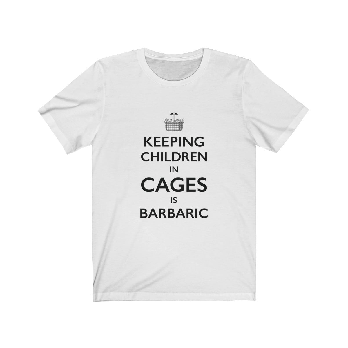 This premium unisex soft cotton tee in the style of the iconic “Keep Calm” British war poster, features the words “Keeping children in cages is barbaric” with a logo design composed of a barbed wire fence and security cameras.