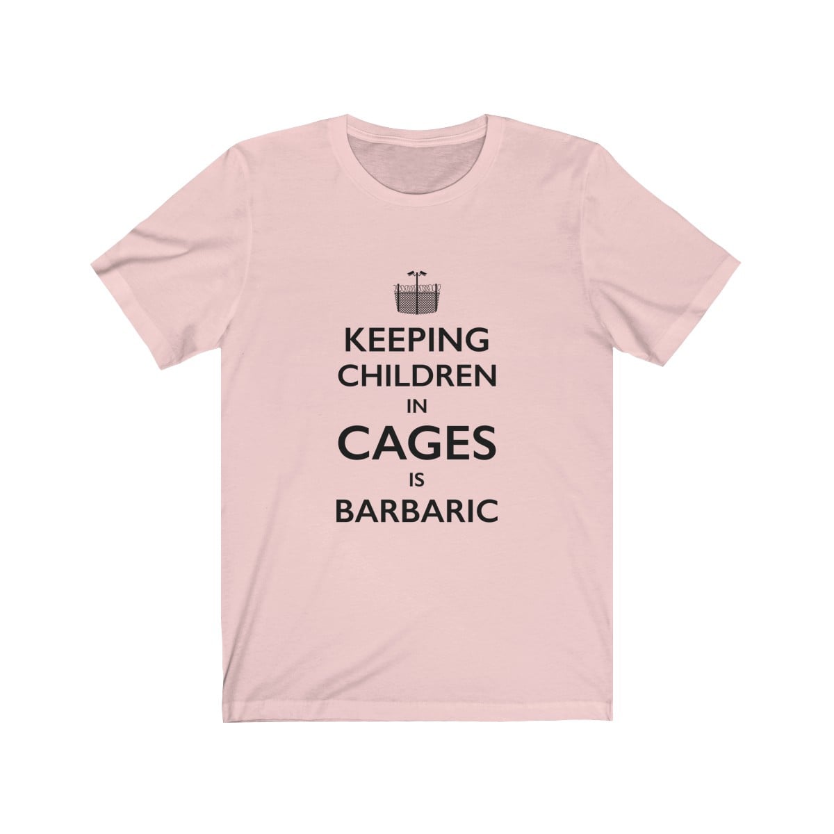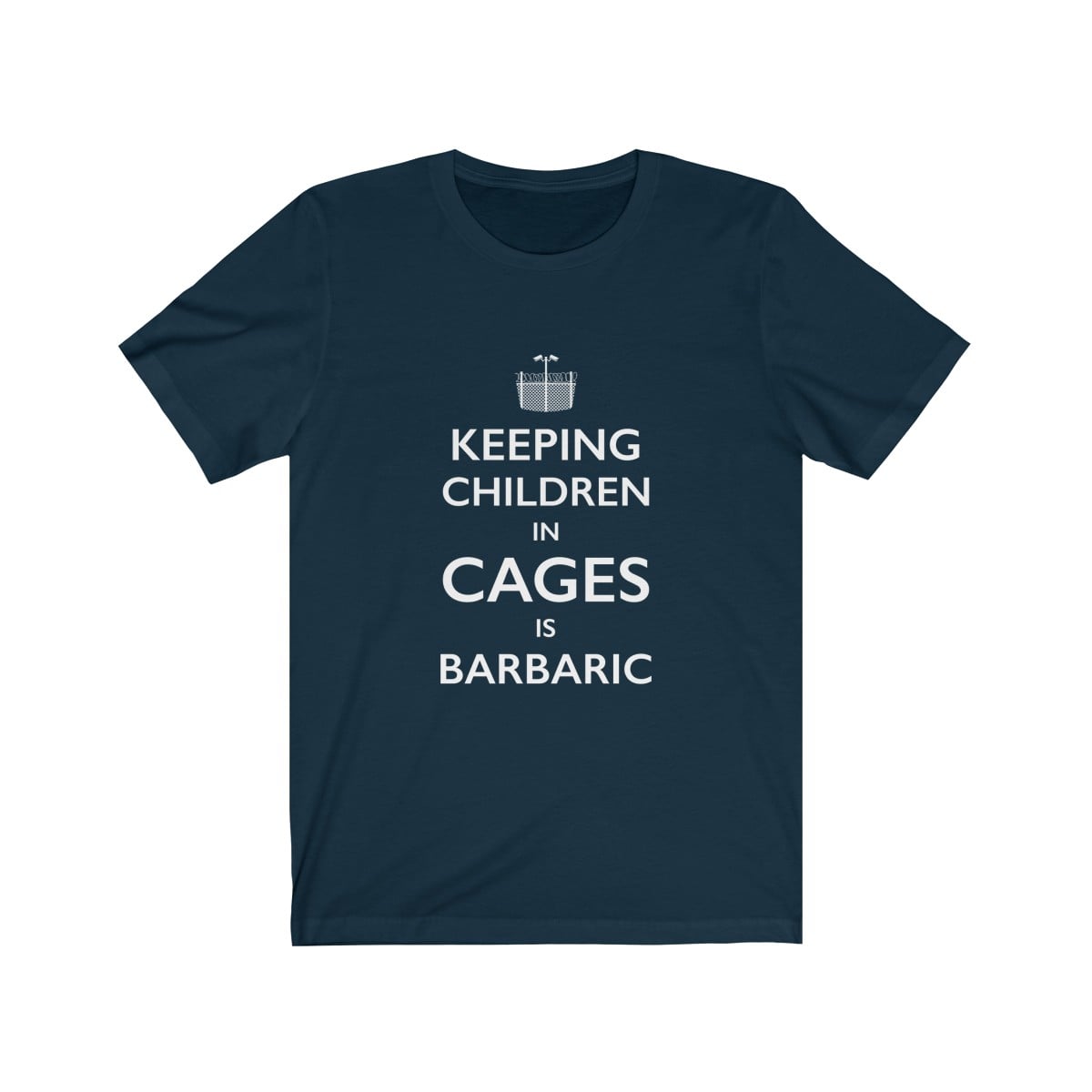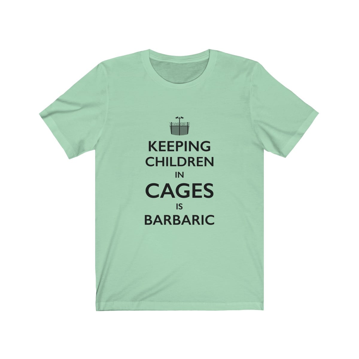 This premium unisex soft cotton tee in the style of the iconic “Keep Calm” British war poster, features the words “Keeping children in cages is barbaric” with a logo design composed of a barbed wire fence and security cameras.