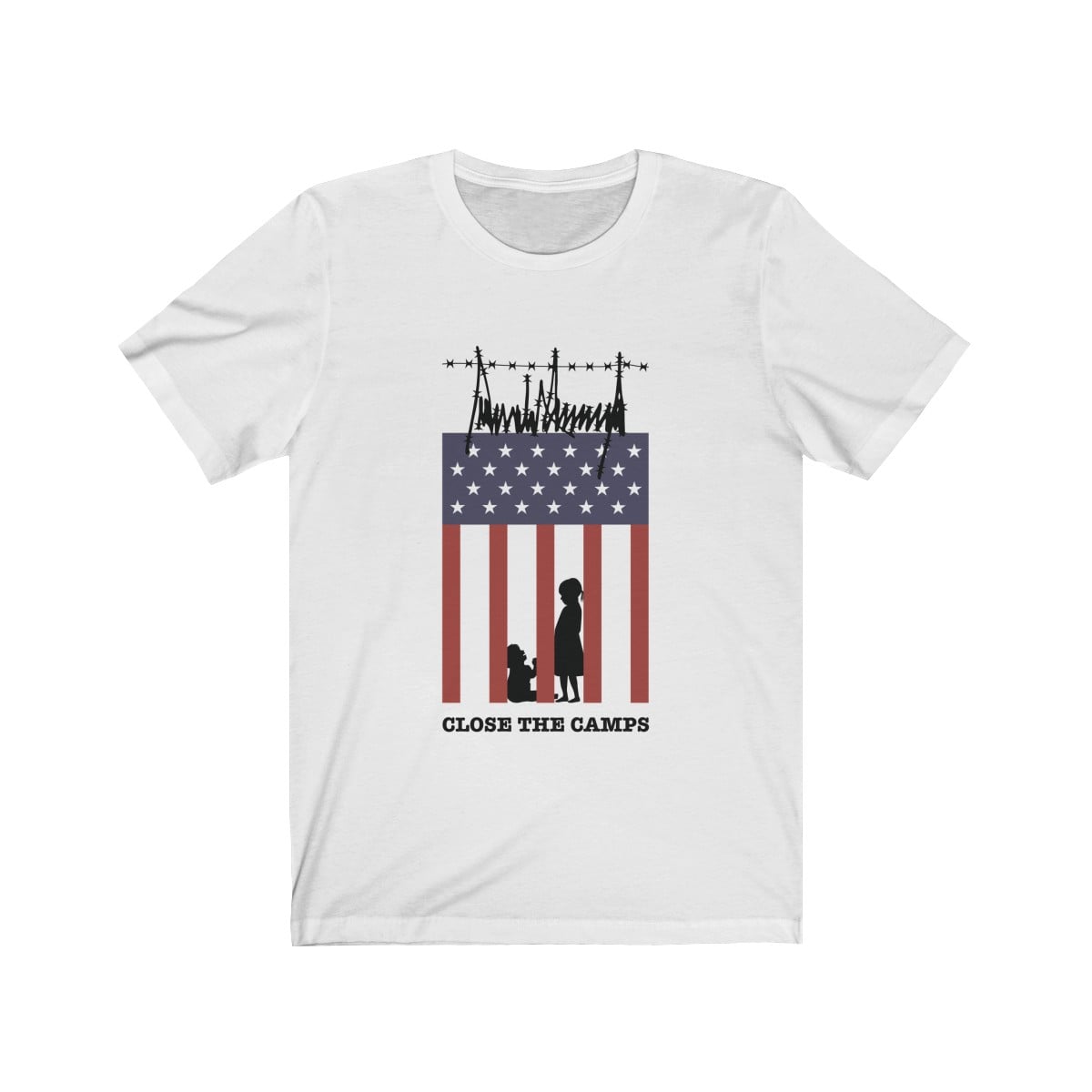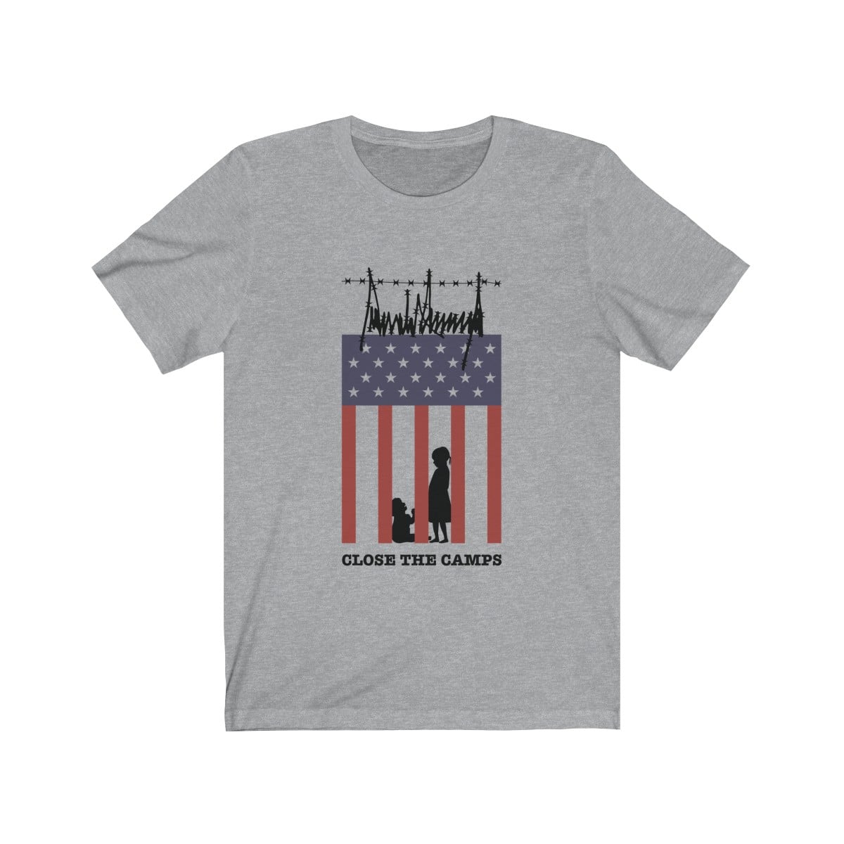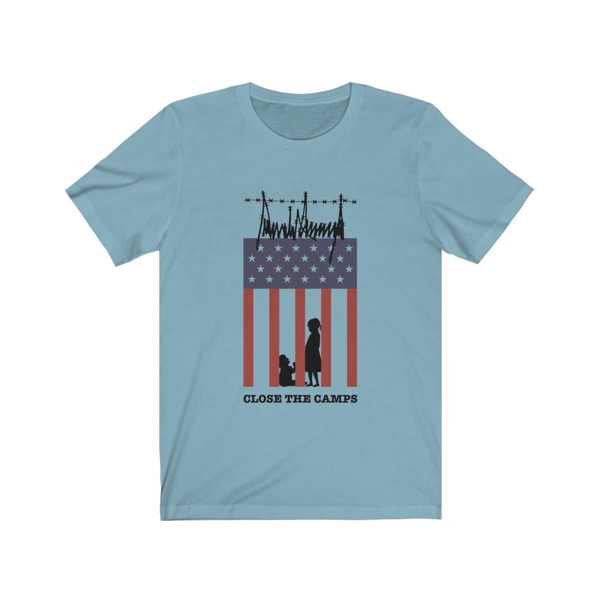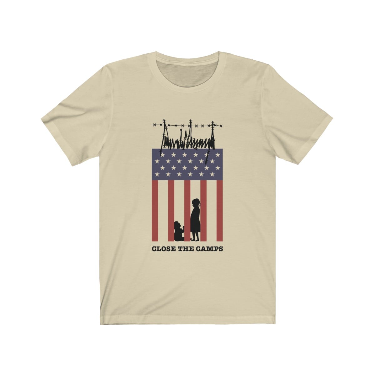 This premium unisex soft cotton tee features a stylized US flag as a detention camp fence containing imprisoned children with Trump’s signature represented by razor wire above and the text “CLOSE THE CAMPS” below.
