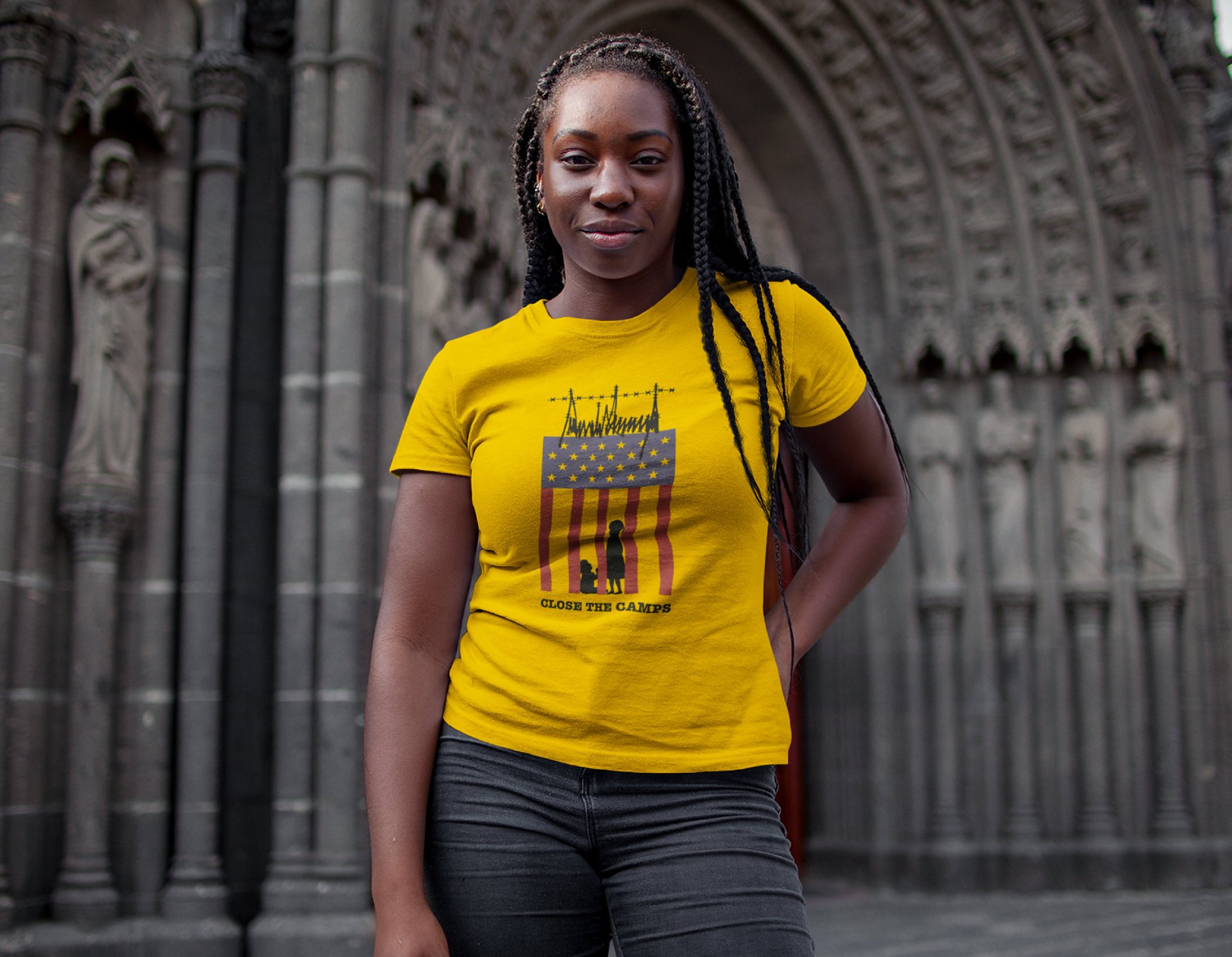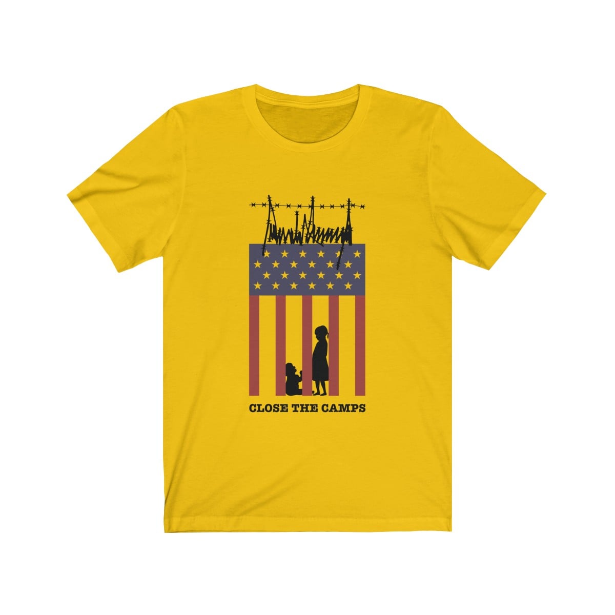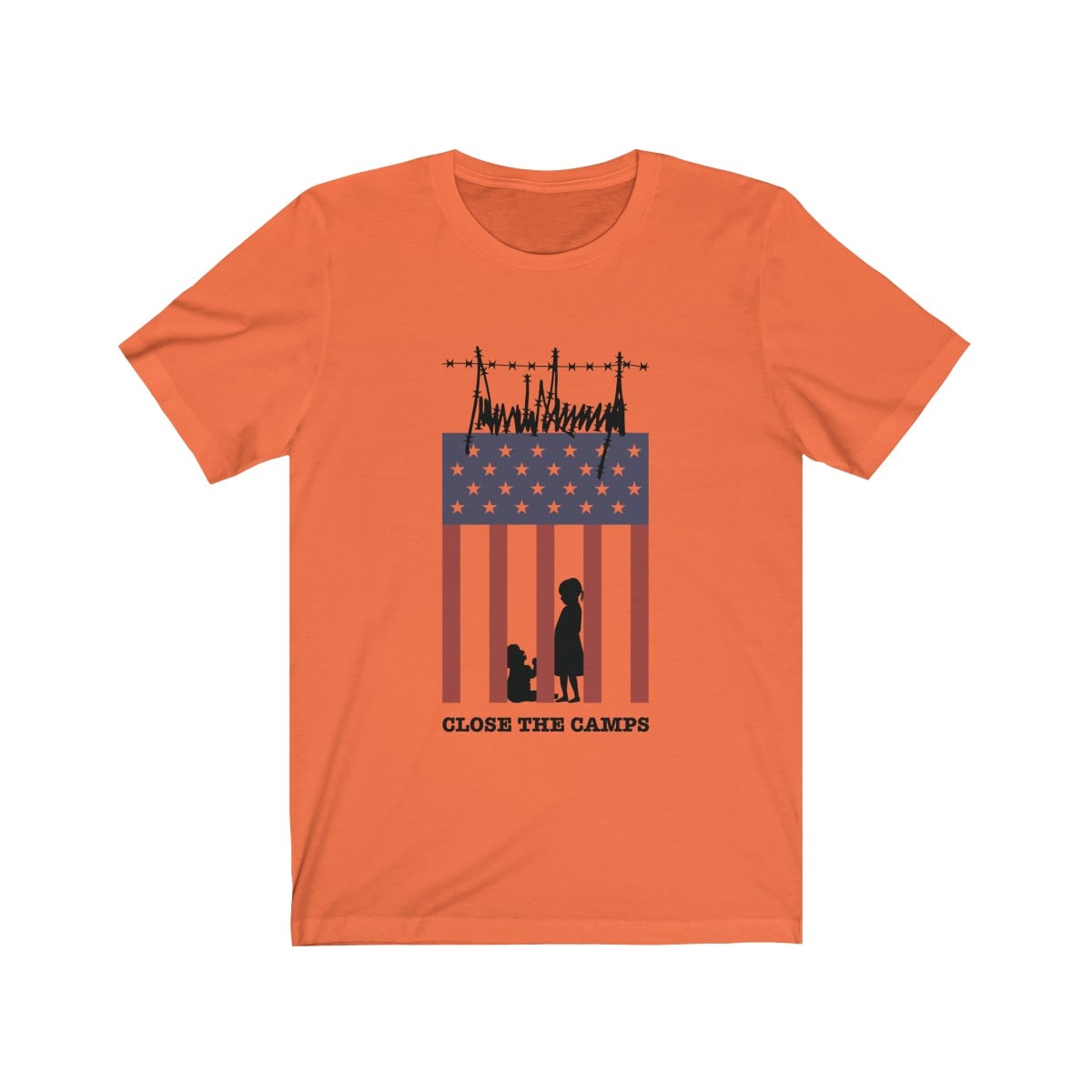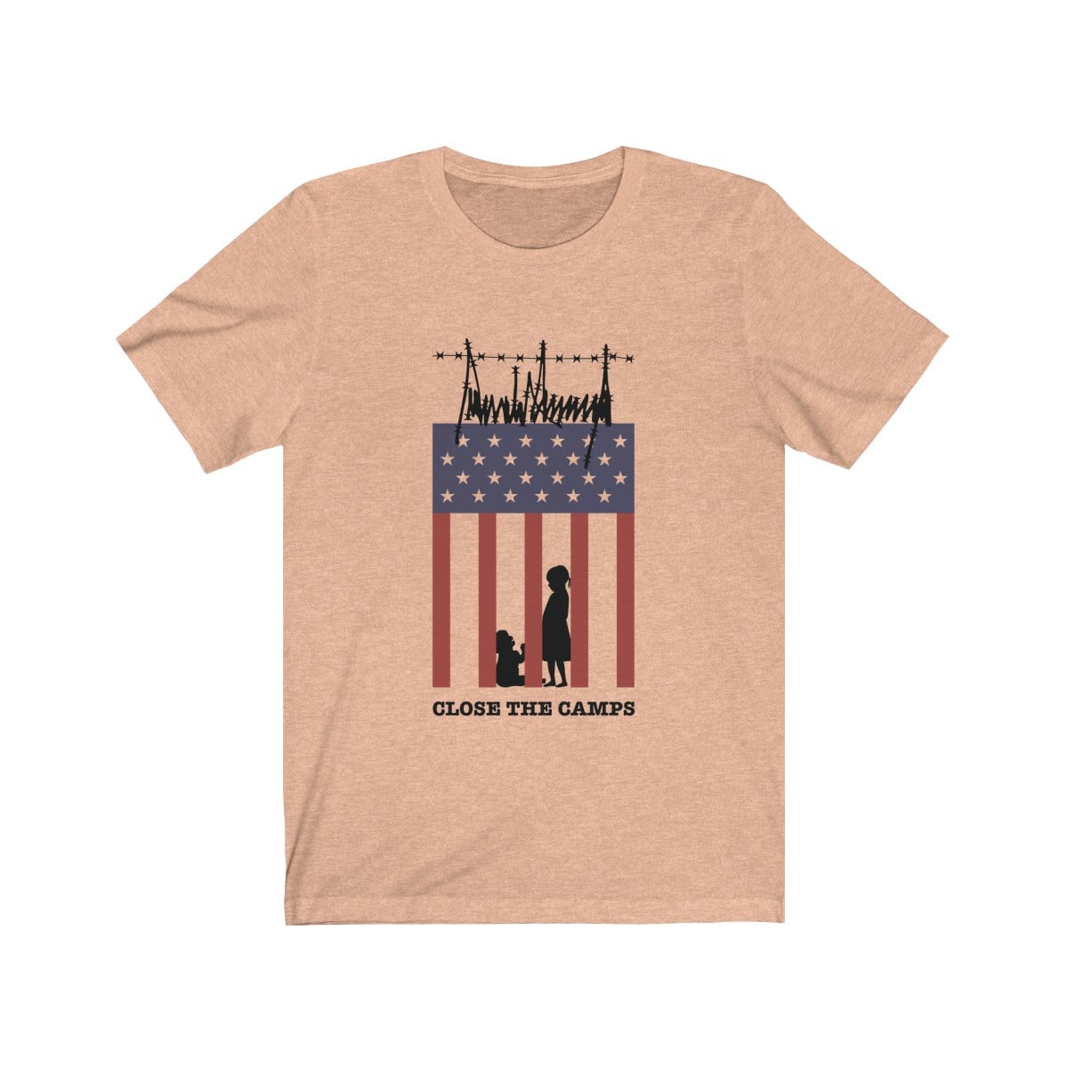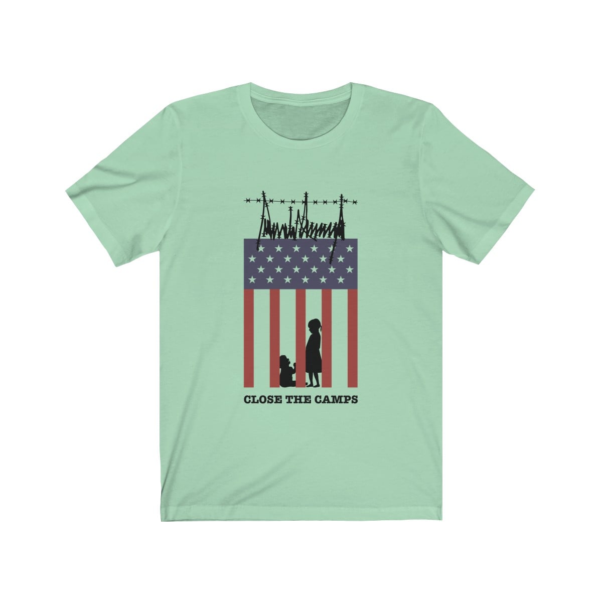 This premium unisex soft cotton tee features a stylized US flag as a detention camp fence containing imprisoned children with Trump’s signature represented by razor wire above and the text “CLOSE THE CAMPS” below.